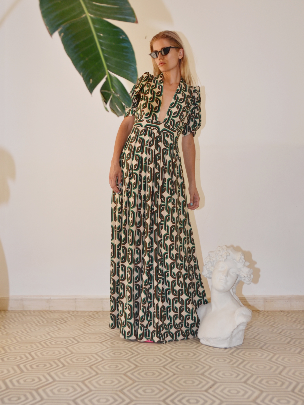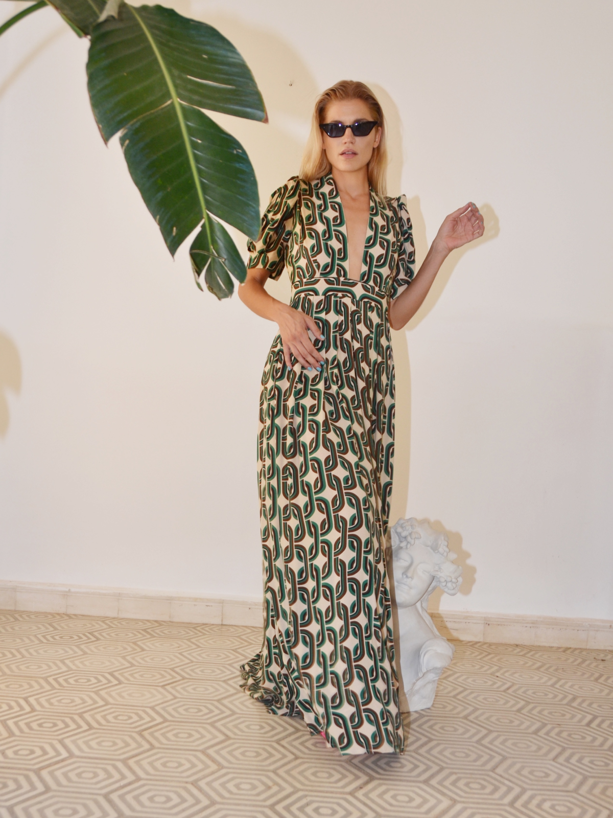 A delicate, long, printed dress the perfect item for your day to night summer look.
