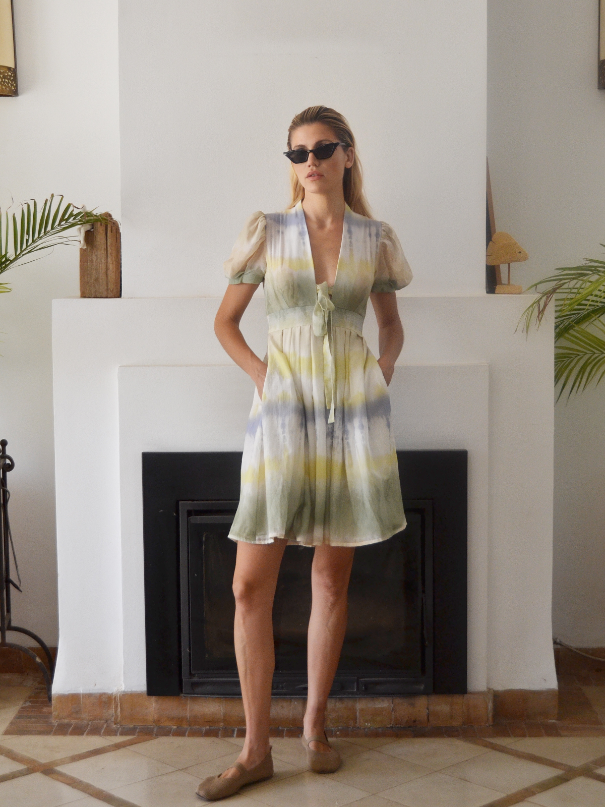 This breezy short dress has a fitted top with short sleeves and beautiful generous above the knee skirt. It is fully lined in light fabric making it the perfect dress for any summer occasion.