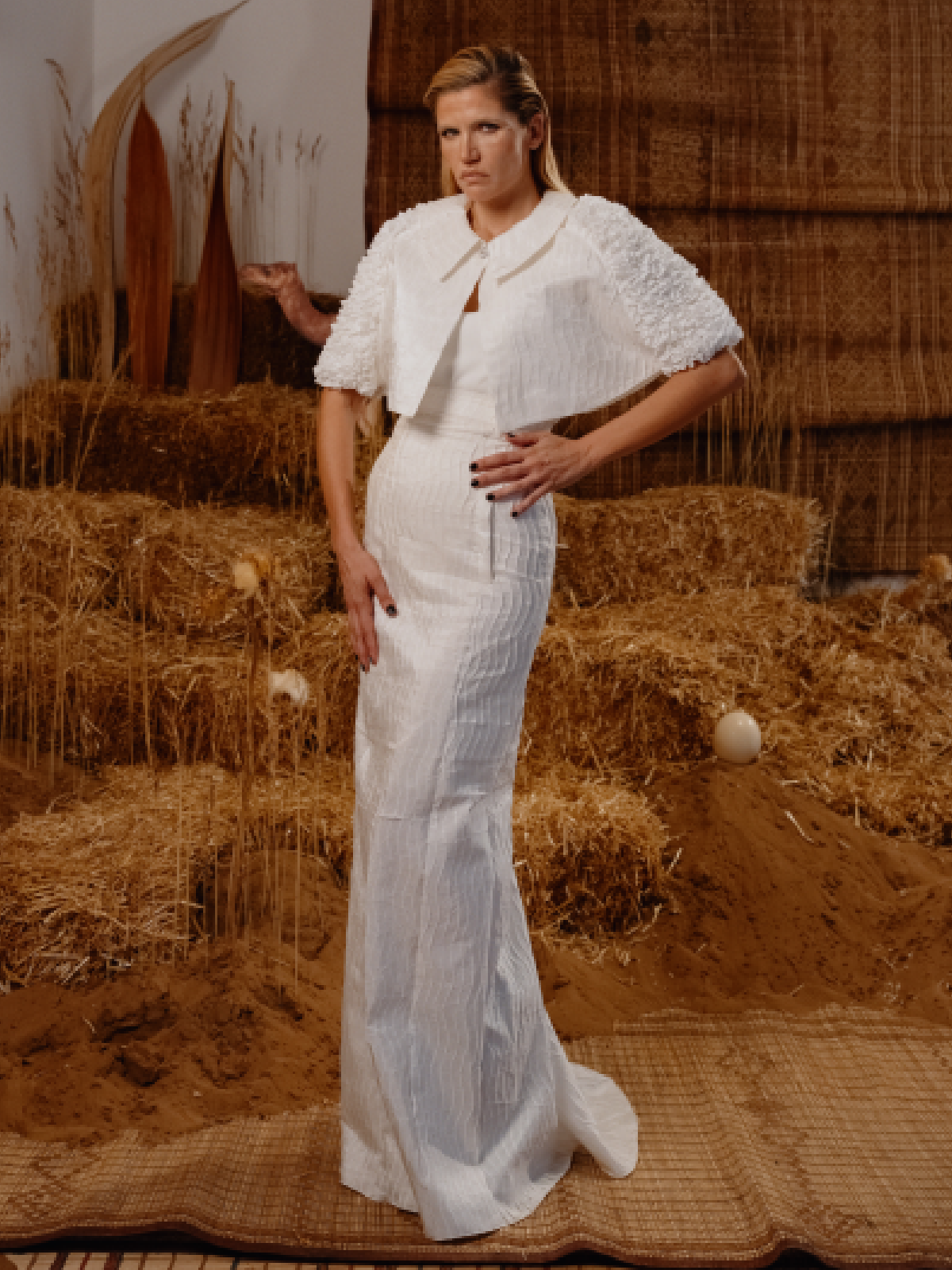 The Marry Me Skirt speaks the language of quiet elegance. Designed as a long, column silhouette, it elongates the form with a sense of serenity and strength. Cut from luminous textured cotton blend, the fabric moves gently with each step, evoking desert light and the purity of a ceremonial moment.