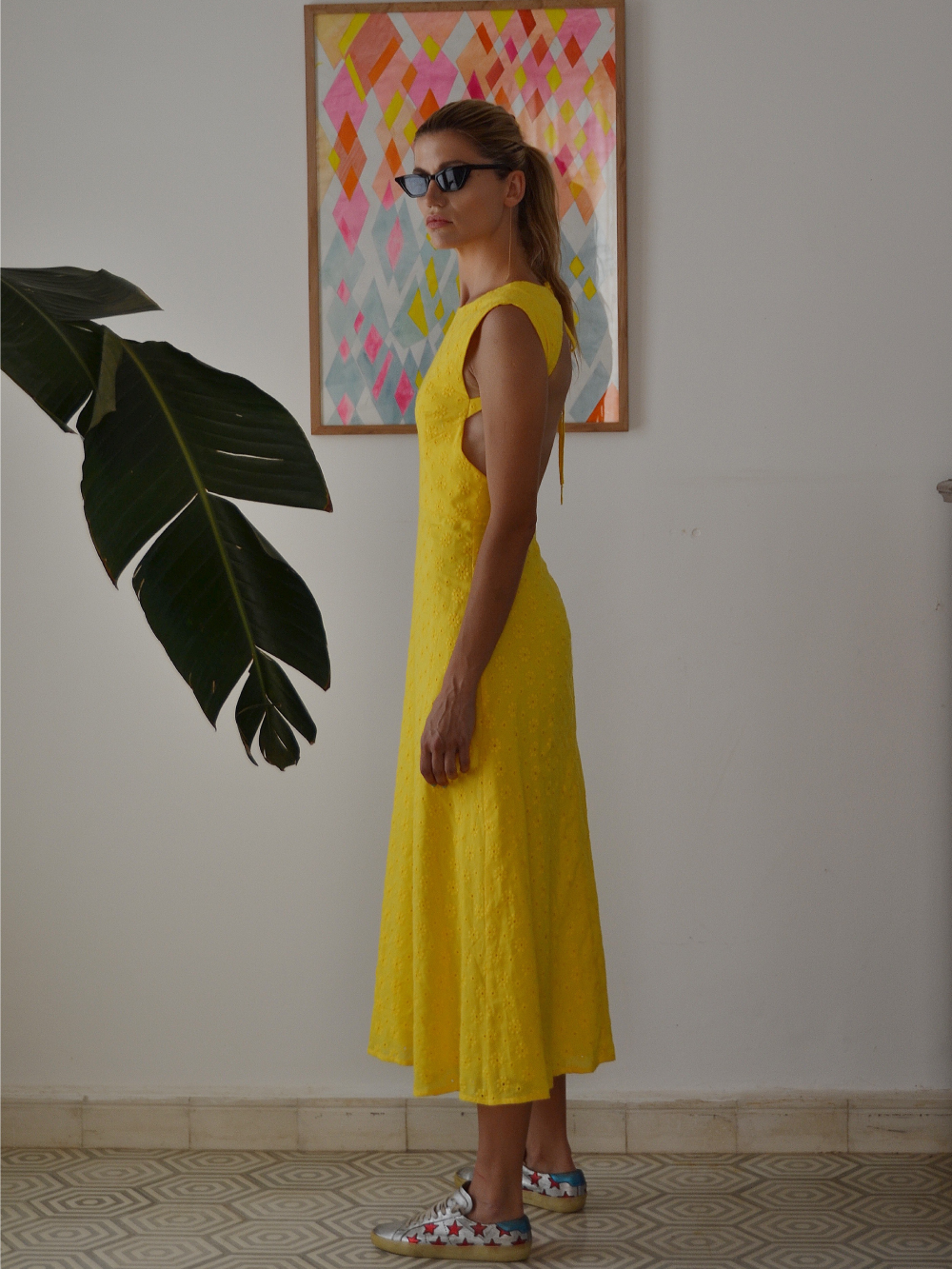 Our Yasmine’s Embroidered backless dress midi with a beautiful back detail