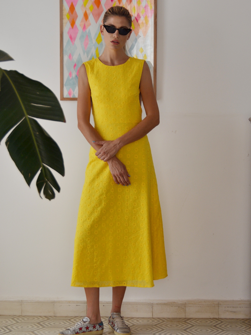 Cut in light embroidered yellow cotton and fully lined with ultra light fabric.